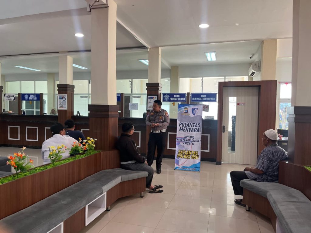 HSU – Dalam rangka meningkatkan kesadaran masyarakat akan pentingnya tertib berlalu lintas, Satuan Lalu Lintas (Satlantas) Polres Hulu Sungai Utara (HSU) melaksanakan kegiatan “Polantas Menyapa” kepada masyarakat wajib pajak dan pemohon Surat Izin Mengemudi (SIM) di ruang pelayanan Samsat dan ruang pelayanan SIM, Senin (29/9/2025).