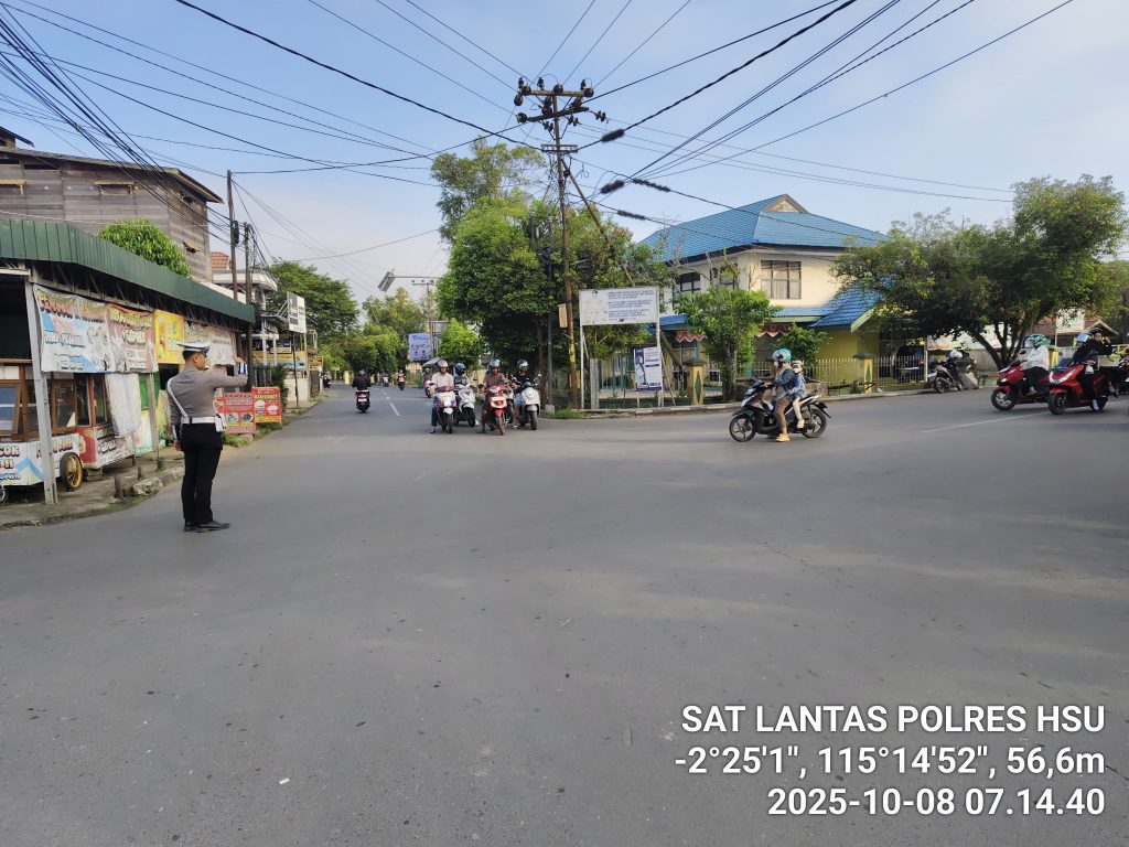 Dalam rangka menjaga kelancaran arus lalu lintas serta menegakkan disiplin berkendara di wilayah hukum Polres Hulu Sungai Utara (HSU), Satuan Lalu Lintas Polres HSU melaksanakan apel pagi dan kegiatan pengamanan serta pengaturan lalu lintas di sejumlah titik strategis di Kota Amuntai, Rabu (08/10/2025) pukul 06.30 WITA. Kegiatan rutin ini digelar di beberapa ruas jalan utama antara lain Jalan A. Yani Amuntai, Jalan Basuki Rahmat, Jalan Pangeran Antasari, Jalan Palampitan, Jalan Banua Lima, Jalan Lambung Mangkurat, Jalan Empu Jatmika, Jalan Negara Dipa, Jalan Kuripan, serta Jalan Rakha.