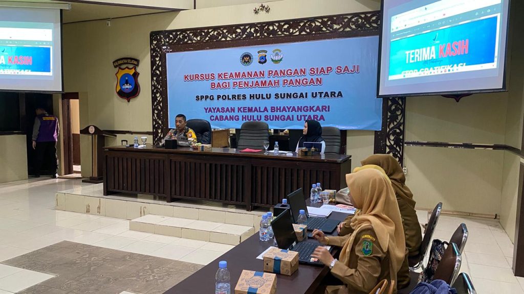 Polres Hulu Sungai Utara (HSU) melalui Yayasan Kemala Bhayangkari Cabang HSU menyelenggarakan Kursus Keamanan Pangan Siap Saji bagi Penjamah Pangan SPPG Polres HSU, bertempat di Aula Jana Nuraga Polres HSU, Jalan Muhajirin, Kelurahan Murung Sari, Kecamatan Amuntai Tengah, Kabupaten Hulu Sungai Utara, pada Senin (26/1/2026).