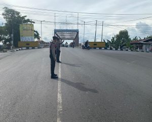 Satuan Lalu Lintas (Sat Lantas) Kepolisian Resor Hulu Sungai Utara (Polres HSU) melaksanakan kegiatan pengamanan dan pengaturan arus lalu lintas di sekitar Jembatan Sungai Kuini,
