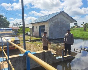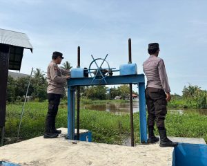 AMUNTAI SELATAN – Jajaran personel Polsek Amuntai Selatan melakukan pengecekan intensif terhadap perkembangan debit air di Sungai Telaga Silaba, Kecamatan Amuntai Selatan, Kabupaten Hulu Sungai